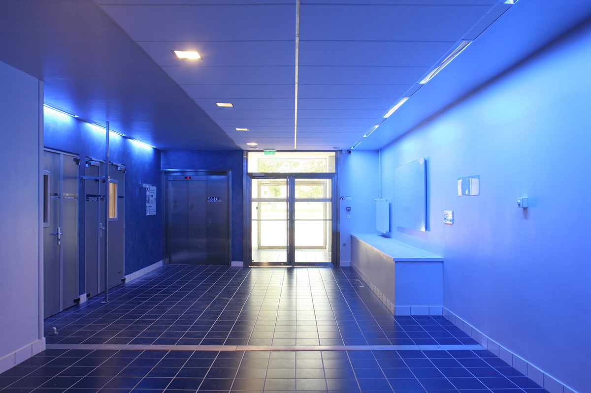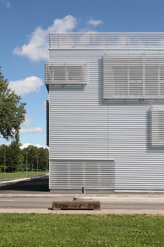 C’est un volume simple en prolongement de l’existant, affirmant son originalité : une architecture technique et de service se protégeant des vues et de l’ensoleillement en façade de laquelle chaque